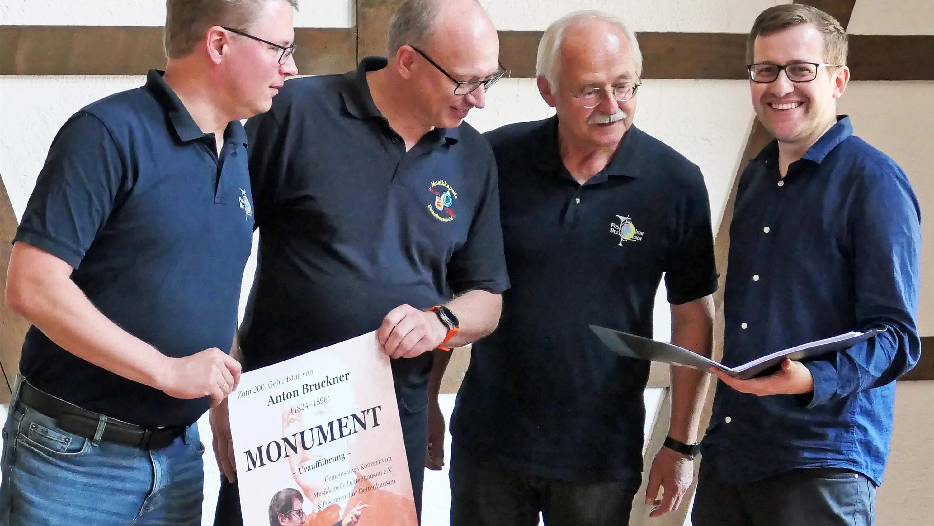 Das etwa halbstündige Werk in Form eines Sinfoniesatzes habe er „im Geiste Bruckners komponiert“, sagt Fabian Bauer. Typische Elemente aus dessen Wirken greife das Werk auf. „Wer sich etwas mit Bruckner auskennt, wird auch einiges zum Schmunzeln darin finden“, verspricht er. Doppeldeutig sei auch der Titel „Monument“ zu verstehen. Einerseits sei das Werk als Hommage und Denkmal für Bruckner gemeint. Zugleich spiele es auch auf dessen Hang zum Monumentalen in der Musik an. Nun gehören Bruckner-Kompositionen, zumal die aus seiner sinfonischen Schaffensperiode, weder für Blaskapellen noch für Posaunenchöre zum Standard-Repertoire. Dass sich die Musiker trotzdem auf dieses Projekt eingelassen haben, sei vor allem Fabian Bauer zu verdanken, ist Alexander Hasel überzeugt: „Dieses Projekt hätte mit keinem anderen Dirigenten geklappt“, glaubt er. Als Dirigent vertrauen ihm die Mitglieder der Musikkapelle, als Kirchenorganist im Ort kennen ihn auch die Mitglieder des Posaunenchors seit langem.